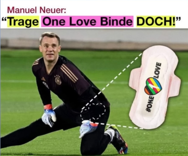 Manuel Neuer: „Trage One Love Binde DOCH!“ (Der Neuer hat leicht reden, denn der muss mit der Binde nur wenig laufen!)