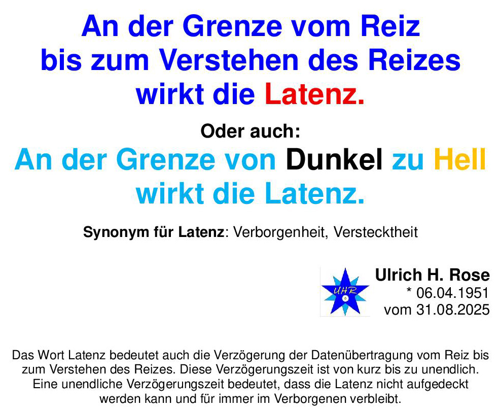 An der Grenze vom Reiz bis zum Verstehen des Reizes wirkt die Latenz. Oder auch: An der Grenze von Dunkel zu Hell wirkt die Latenz. Synonym für Latenz: Verborgenheit, Verstecktheit. Ulrich H. Rose vom 31.08.2025