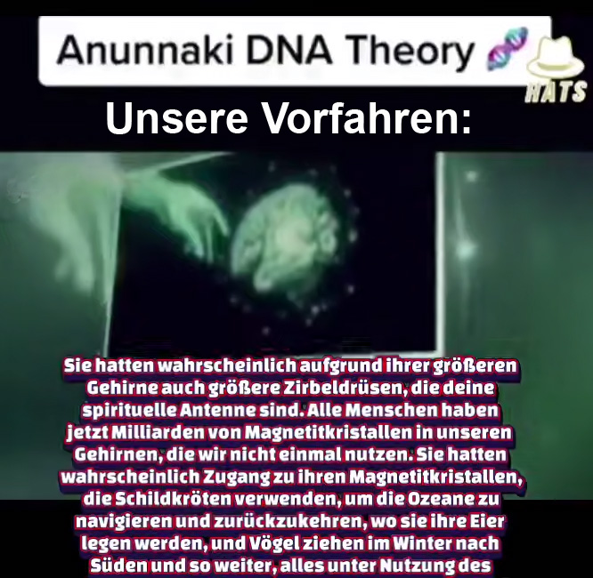 Anunnaki DNA Theory. Unsere Vorfahren: Sie hatten wahrscheinlich aufgrund ihrer größeren Gehirne auch größere Zirbeldrüsen, die deine spirituelle Antenne sind. Alle Menschen haben jetzt Milliarden von Magnetitkristallen in unseren Gehirnen, die wir nicht einmal nutzen. Sie hatten wahrscheinlich Zugang zu ihren Magnetitkristallen, die Schildkröten verwenden, um die Ozeane zu navigieren und zurückzukehren, wo sie ihre Eier legen werden, und Vögel ziehen im Winter nach Süden und so weiter, alles unter Nutzung des „archaischen Gehirns„. Dort ist zu lesen: „die Steuerung übernimmt immer noch und unverändert zu 99,999% ein archaisches Gehirn, welches den Tieren gleichzusetzen ist“