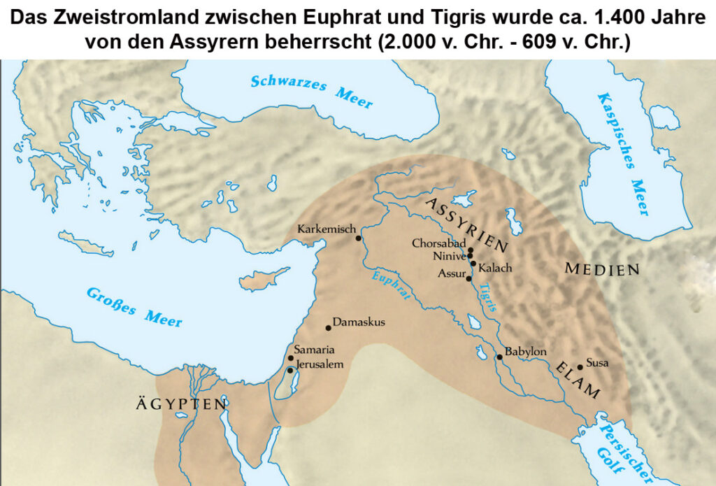 Das Zweistromland zwischen Euphrat und Tigris wurde ca. 1.400 Jahre von den Assyrern beherrscht. (2.000 v. Chr. – 609 v. Chr.)