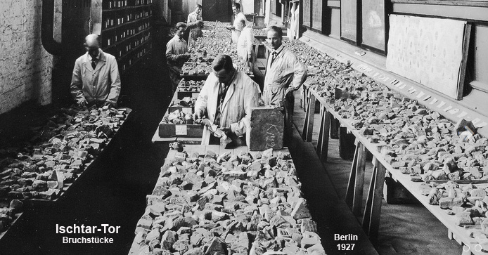 So kam das Ischtar-Tor 1926 in Berlin an und wurde 1927 gesichtet und wieder zusammengefügt, so dass das Ischtar-Tor erstmals 1930 in voller Pracht im jetzt fertiggestellten Pergamon-Museum (Bauzeit 910 – 1930) gezeigt werden konnte: