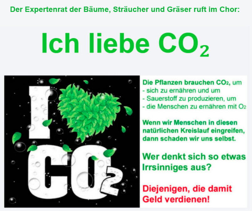 Der Expertenrat der Bäume Sträucher und Gräser ruft im Chor: Ich liebe CO2. Die Pflanzen brauchen CO2, um sich – zu ernähren und um – Sauerstoff zu produzieren, um – die Menschen zu ernähren mit O2. Wenn wir Menschen in diesen natürlichen Kreislauf eingreifen, dann schaden wir uns selbst. Wer denkt sich so etwas Irrsinniges aus? Diejenigen, die damit Geld verdienen!