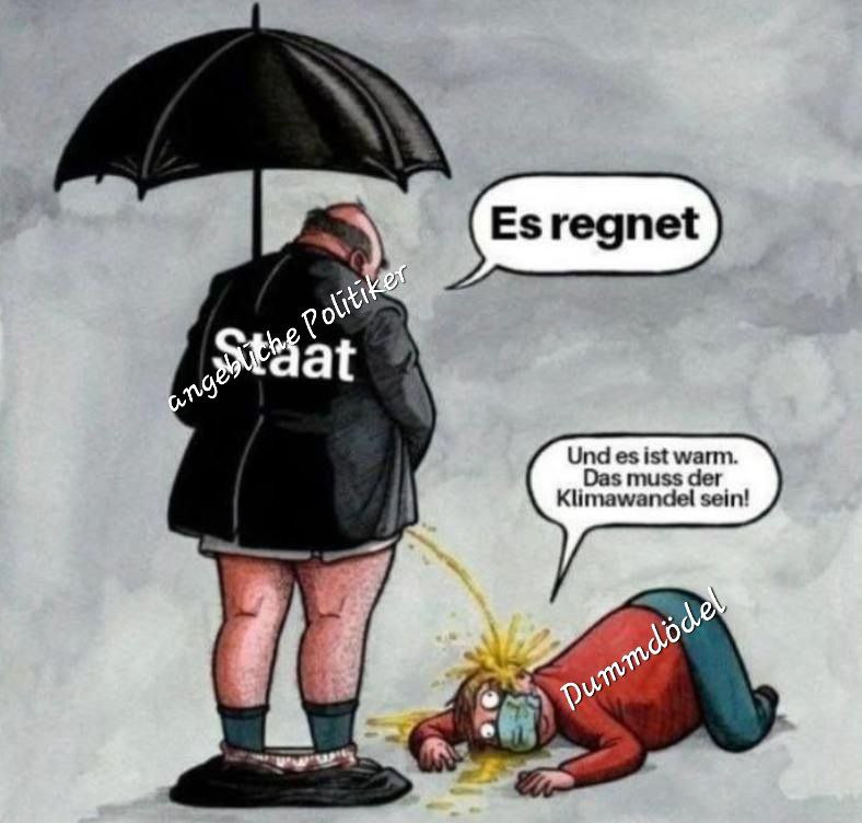 Es regnet (angebliche Politiker, Staat) Und es ist warm. Das muss der Klimawandel sein. Dummdödel