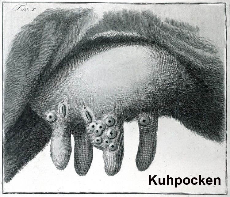 80 Jahre später schien der Stein der Weisen mit den „Kuhpocken“ gefunden worden zu sein. Ein seltener Hautausschlag an Eutern milchgebender Kühe. Der englische Landchirurg Edward Jenner (1749-1823) behauptete einfach ohne Mikroskop, dass es sich dabei um eine gutartige Pockenvariante handeln würde, die dennoch vor den echten Pocken Schutz bieten würde. Obwohl nur Kühe diesen Hautausschlag bekamen, die gemolken wurden, kam er nicht auf die Idee, dass nicht kranke Kühe die Melkerinnen ansteckten, sondern umgekehrt!