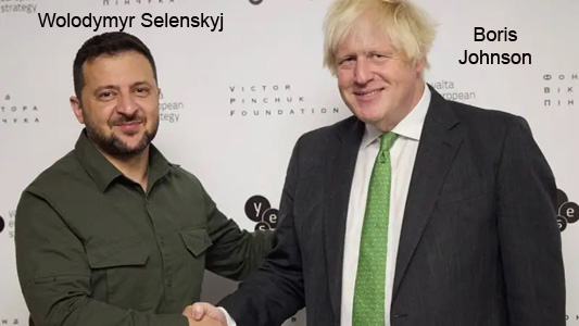 Offensichtlich hatten die westlichen Staaten ihre Strategie geändert und setzen nun – unterstützt von der Lieferung immer schwerer Waffen – auf einen Sieg der Ukraine und eine dauerhafte Schwächung Russlands. Spätestens mit dem Besuch Johnsons bei Selenskyj Anfang April 2022 wurde dies auch der Ukraine mitgeteilt. Seitdem sind die Aussichten auf einen Waffenstillstand und Verhandlungsfrieden in immer weitere Ferne gerückt.