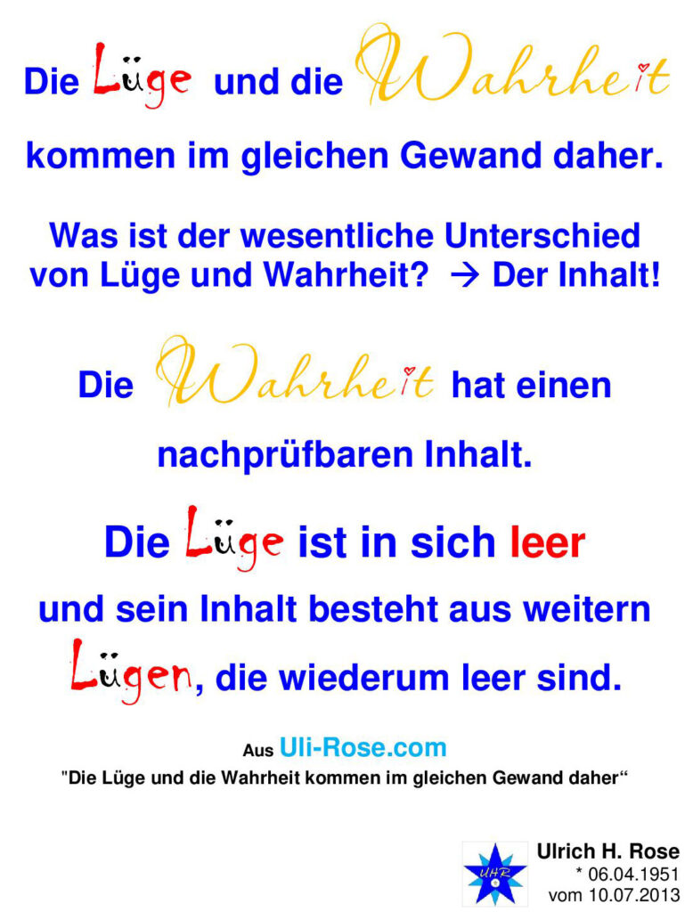 Die Lüge und die Wahrheit kommen im gleichen Gewand daher. Was ist der wesentliche Unterschied von Lüge und Wahrheit? -> Der Inhalt. Die Wahrheit hat einen nachprüfbaren Inhalt. Die Lüge ist in sich leer und sein Inhalt besteht aus weitern Lügen, die wiederum leer sind. Ulrich H. Rose vom 10.07.2013