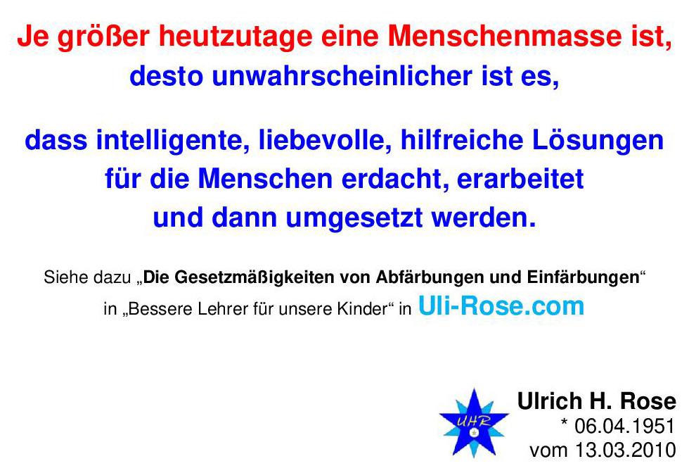 Je größer heutzutage eine Menschenmasse, desto unwahrscheinlicher ist es, dass intelligente, liebevolle, hilfreiche Lösungen für die Menschen erdacht, erarbeitet und dann umgesetzt werden. Spruch von Ulrich H. Rose vom 13.03.2010