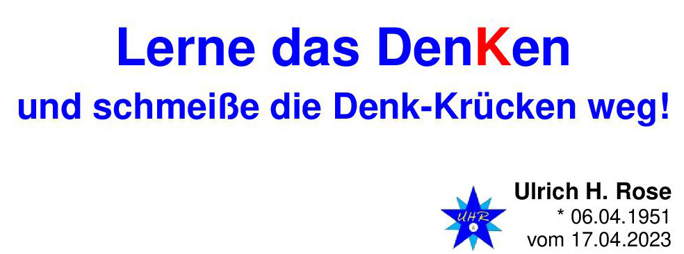 Vorweg: In dieser Abhandlung gibt es einige bis viele LINKS in rot. Wenn Du in diese eintauchst, dann kannst Du Dich dort verlieren und nicht mehr hierher zurückfinden, weil es dort weitere LINKS gibt. Dies alles mit den LINKS ist in meinem Kopf vorhanden und es wäre zum besseren Verständnis wichtig, diese LINKS zu lesen. Zwei Tipps dazu: 1. Überlese erst mal die LINKS und schaue sie später an. 2. Lege einen Zettel vor Dich hin und schreibe Dir wichtige Eckpunkte auf, um wieder hierher zurückzufinden.