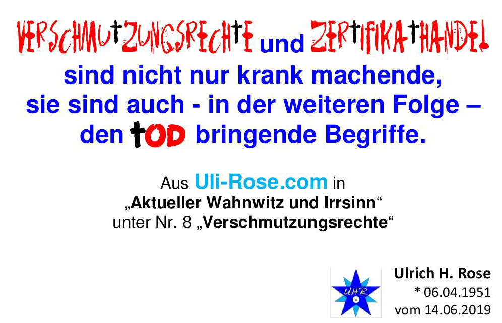 Verschmutzungsrechte und Zertifikathandel sind nicht nur krank machende, sie sind auch – in der weiteren Folge – den Tod bringende Begriffe! Spruch von Ulrich H. Rose vom 14.06.2019