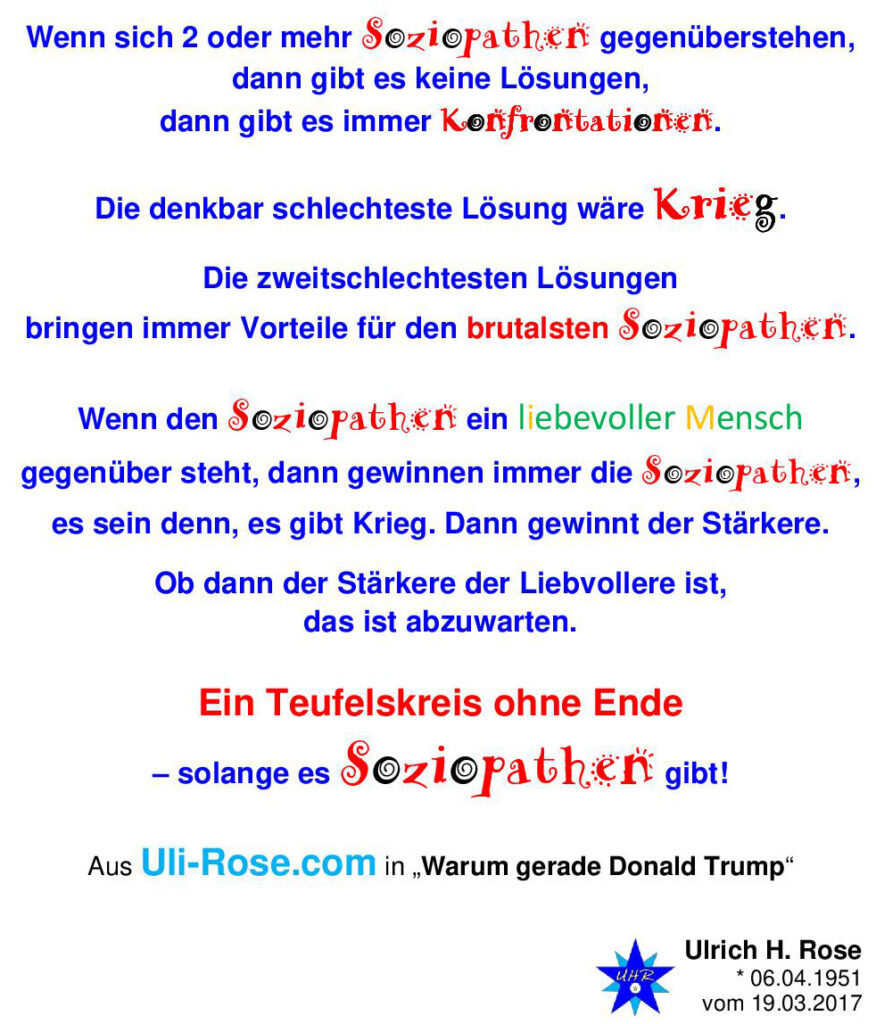 Wenn sich 2 oder mehr Soziopathen gegenüberstehen, dann gibt es keine Lösungen, dann gibt es immer Konfrontationen. Die denkbar schlechteste Lösung wäre Krieg. Die zweitschlechtesten Lösungen bringen immer Vorteile für den brutalsten Soziopathen. Wenn den Soziopathen ein liebevoller Mensch gegenüber steht, dann gewinnen immer die Soziopathen, es sein denn, es gibt Krieg. Dann gewinnt der Stärkere. Ob dann der Stärkere der Liebvollere ist, das ist abzuwarten. Ein Teufelskreis ohne Ende – solange es Sozioathen gibt! Ulrich H. Rose vom 19.03.2017