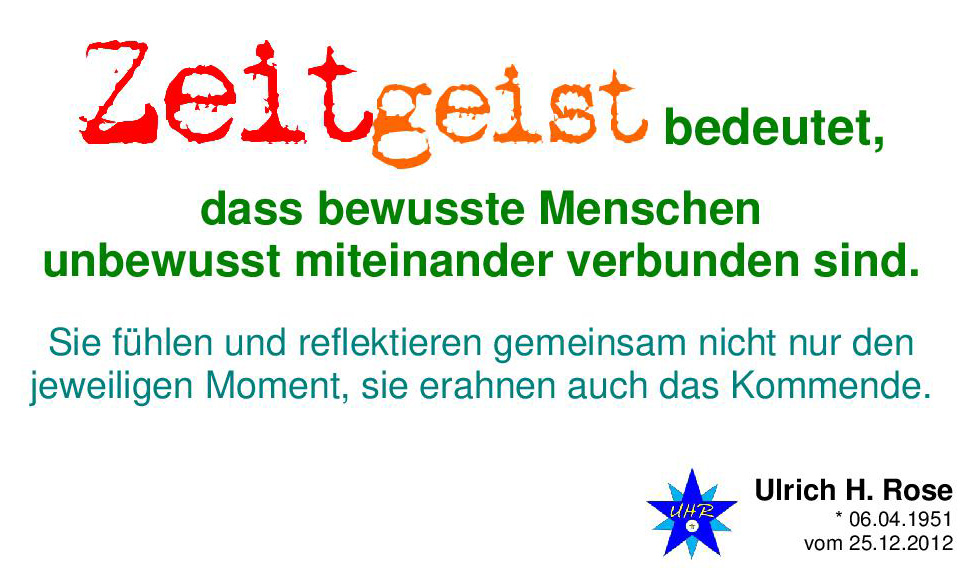 Zeitgeist bedeutet, dass bewusste Menschen unbewusst miteinander verbunden sind. Sie fühlen und reflektieren gemeinsam nicht nur den jeweiligen Moment, sie erahnen auch das Kommende. Ulrich H. Rose vom 25.12.2014