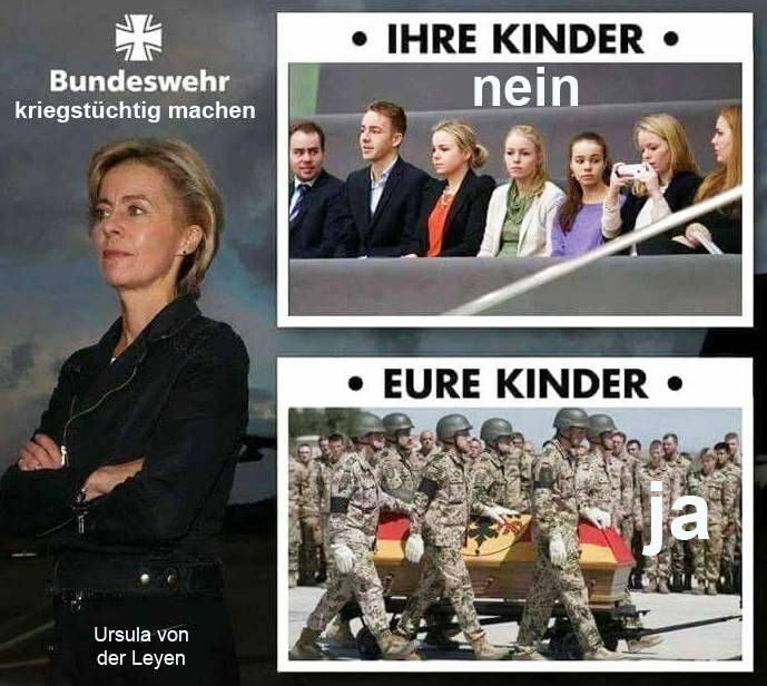 Bundeswehr kriegstüchtig machen. Ursula von der Leyen Ihre Kinder. Eure Kinder