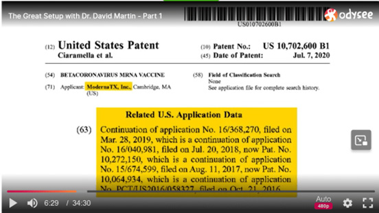 Und jetzt kommt das Entscheidende: Bereits im Frühjahr 2019 – April 2019 – reichte Moderna vier Patentanträge ein, die zuvor abgelehnt worden waren. Und was war in diesen Patentanträgen plötzlich enthalten? Die Formulierung „unbeabsichtigte oder absichtliche Freisetzung eines respiratorischen Erregers“. Das war im April 2019. Das war lange bevor es den „China-Virus“ überhaupt gab.
