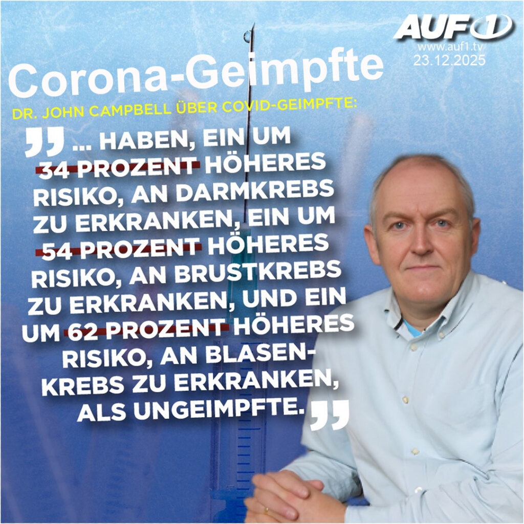 AUF1 31.12.2025. Corona-Geimpfte haben ein um 34 Prozent höheres Risiko an Darmkrebs zu erkranken, ein um 54 Prozent höheres Risiko an Brustkrebs zu erkranken, und ein um 62 Prozent höheres Risiko an Blasenkrebs zu erkranken, als Ungeimpfte. Dr. John Campbell (* 17. Mai 1958 in Ayrshire, Scotland) ist ein britisch-amerikanischer Ökonom und Hochschullehrer.