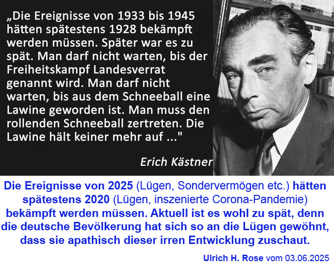 Die Ereignisse von 2025 (Lügen, Sondervermögen etc.) hätten spätestens 2020 (Lügen, inszenierte Corona-Pandemie) bekämpft werden müssen. Aktuell ist es wohl zu spät, denn die deutsche Bevölkerung hat sich so an die Lügen gewöhnt, dass sie apathisch dieser irren Entwicklung zuschaut. Ulrich H. Rose vom 03.06.2025