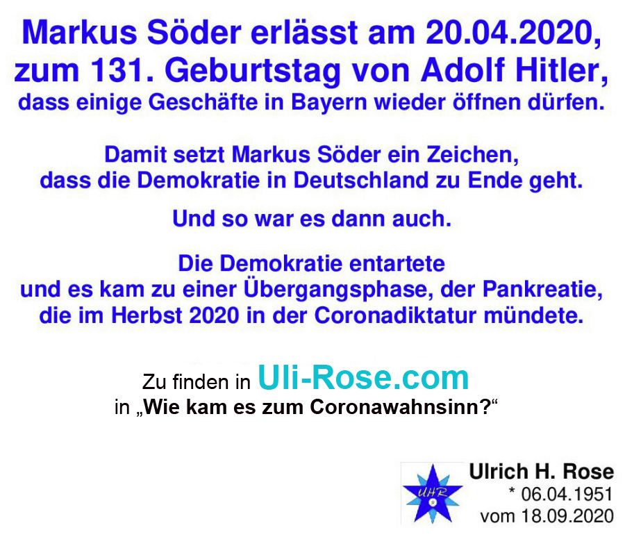 Markus Söder erlässt am 20.04.2020, zum 131. Geburtstag von Adolf Hitler, dass einige Geschäfte in Bayern wieder öffnen dürfen. Damit setzt Markus Söder ein Zeichen, dass die Demolratie in Deutschland zu Ende geht. Und so war es dann auch. Die Domkratie entartete und es kam in der Übergangsphase, der Pankreatie, die im Herbst 2020 in der Coronadiktatur mündete. Ulrich H. Rose vom 18.09.2020