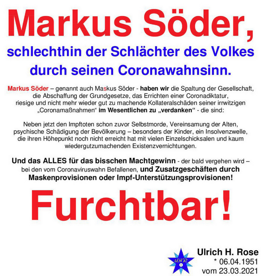 Markus Söder, schlechthin der Schlächter des Volkes durch seinen Coronawahnsinn. Markus Söder – genannt auch Maskus Söder – haben wir die Spaltung der Gesellschaft, die Abschaffung der Grundgesetze, das Errichten einer Coronadiktatur, riesige und nicht wieder gut zu machende Kollateralschäden seiner irrwitzigen „Coronamaßnahmen“ im Wesentlichen zu „Verdanken“ – die sind: Neben jetzt den Impftoten schon zuvor Selbstmorde, Vereinsamung der Alten, psychische Schäden der Bevölkerung – besonders der Kinder, eine Insolvenzwelle, die ihren Höhepunkt noch nicht erreicht hat mit vielen Einzelschicksalen und kaum wiedergutzumachenden Existenzvernichtungen. Markus Söder schlechthin der Schlächter des Volkes durch seinen Coronawahnsinn – der bald vergehen wird – bei den vom Coronaviruswahn Befallenen, und Zusatzgeschäften durch Maskenprovisionen oder Impf-Unterstützungsprovisionen! Furchtbar! Ulrich H. Rose vom 23.03.2021