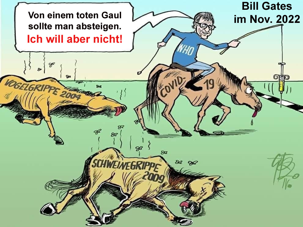 Von einem toten Gaul sollte man absteigen. Ich will aber nicht. Vogelgrippe 2004, Schweinegrippe 2009, COVID-19. Bill Gates im Nov. 2022