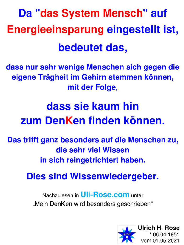 Da das System Mensch auf Energieeinsparung eingestellt ist, bedeutet das, dass nur sehr wenige Menschen sich gegen die eigene Trägheit im Gehirn stemmen können, mit der Folge, dass sie kaum hin zum DenKen finden können. Das trifft ganz besonders auf die Menschen zu, die sehr viel Wissen in sich reingetrichtert haben. Dies sind Wissenwiedergeber. Ulrich H. Rose vom 01.05.2021