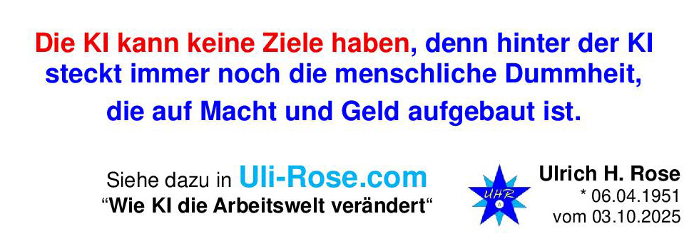 Die KI kann keine Ziele haben, denn hinter der KI steckt immer noch die menschliche Dummheit, die auf Macht und Geld aufgebaut ist. Ulrich H. Rose vom 03.10.2025
