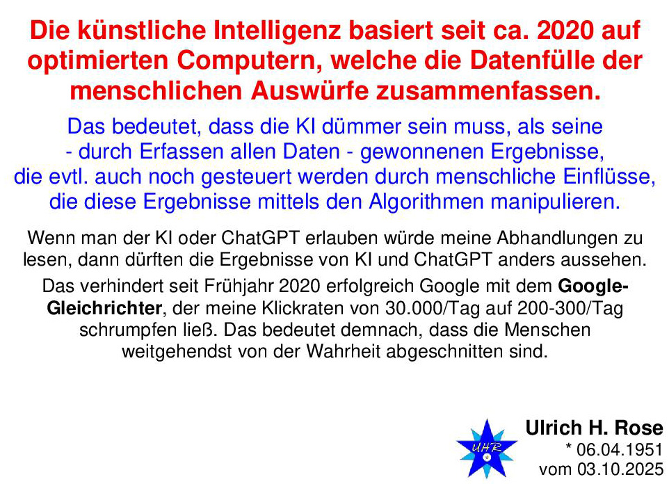 Die künstliche Intelligenz basiert seit ca. 2020 auf optimierten Computern, welche die Datenfülle der menschlichen Auswürfe zusammenfassen. Ulrich H. Rose vom 03.10.2025